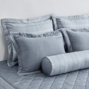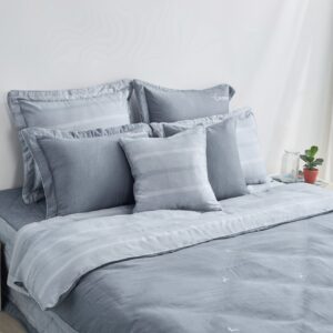 Bộ chăn ga này được kết hợp cả vải in và thêu. Họa tiết con hươu thật nhỏ được thêu điểm xuyết rải đều trên mặt chăn, tạo điểm nhấn cho bộ chăn ga không bị nhàm chán.Gam màu xanh ghi rất khéo léo tôn lên sự cuốn hút, nam tính và mạnh mẽ cho bộ sản phẩm này.